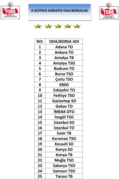 A Seviyesi Akredite Oda/Borsalar Listesi