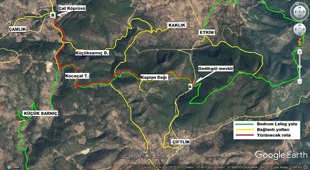 - Bodrum Ticaret Odası önünden hareket edecek servislerle Gedikligöl Mevkiine ulaşılarak açılış konuşmaları ve tören sonrasında yürüyüşümüz, Çiftlik-Etrim karayolunun kot olarak en yüksek noktasında, 260 kotlarında Gedikgöl mevkiinde ( A noktası ) başlayacak olup, yaklaşık 460 kotlarında batıdaki Kaplan dağına tırmanılacaktır.