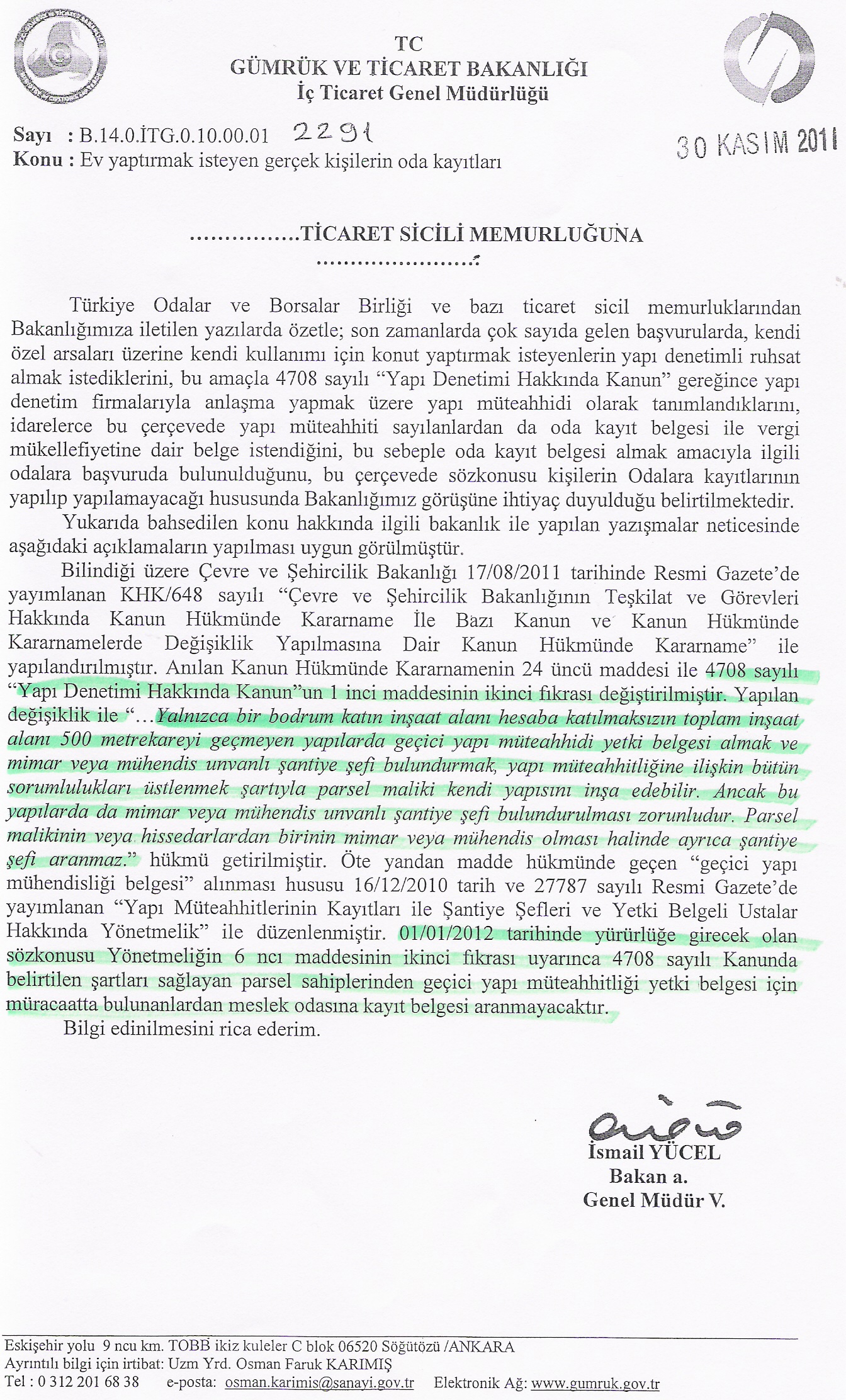 Türkiye Odalar ve Borsalar Birliği' nden Odamıza gelen ve Gümrük ve Ticaret Bakanlığı İç Ticaret Genel Müdürlüğü'nden gönderilen ev yaptırmak isteyen gerçek kişilerin oda kayıtları hakkındaki yazı aşağıda verilmiştir.