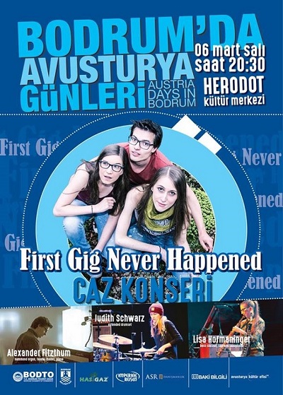 Avusturya Kültür Ofisi, Bodrum Ticaret Odası, Bodrum Belediyesi işbirliğiyle Baki Bilgili'nin koordinasyonunda gerçekleştirilen "Bodrum'da Avusturya Günleri" kapsamında 6 Mart 2018 Salı günü saat 20:30 da Heredot Kültür Merkezi'nde “First Gig Never Happened” caz konseri düzenlenecektir.