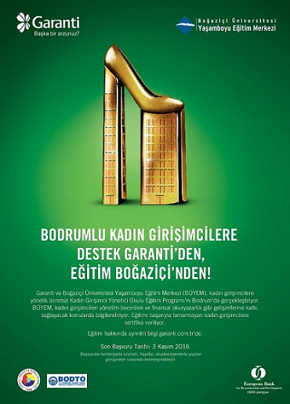 Garanti Bankası ile Boğaziçi Üniversitesi Yaşamboyu Eğitim Merkezi (BÜYEM) işbirliği ve TC Bodrum Ticaret odası desteğiyle kadın girişimcilere yönelik ÜCRETSİZ olarak düzenlenecek olan “Kadın Girişimci Yönetici Okulu” eğitim programı, 4 Kasım 2016 tarihinde Bodrum'da başlayacak.
