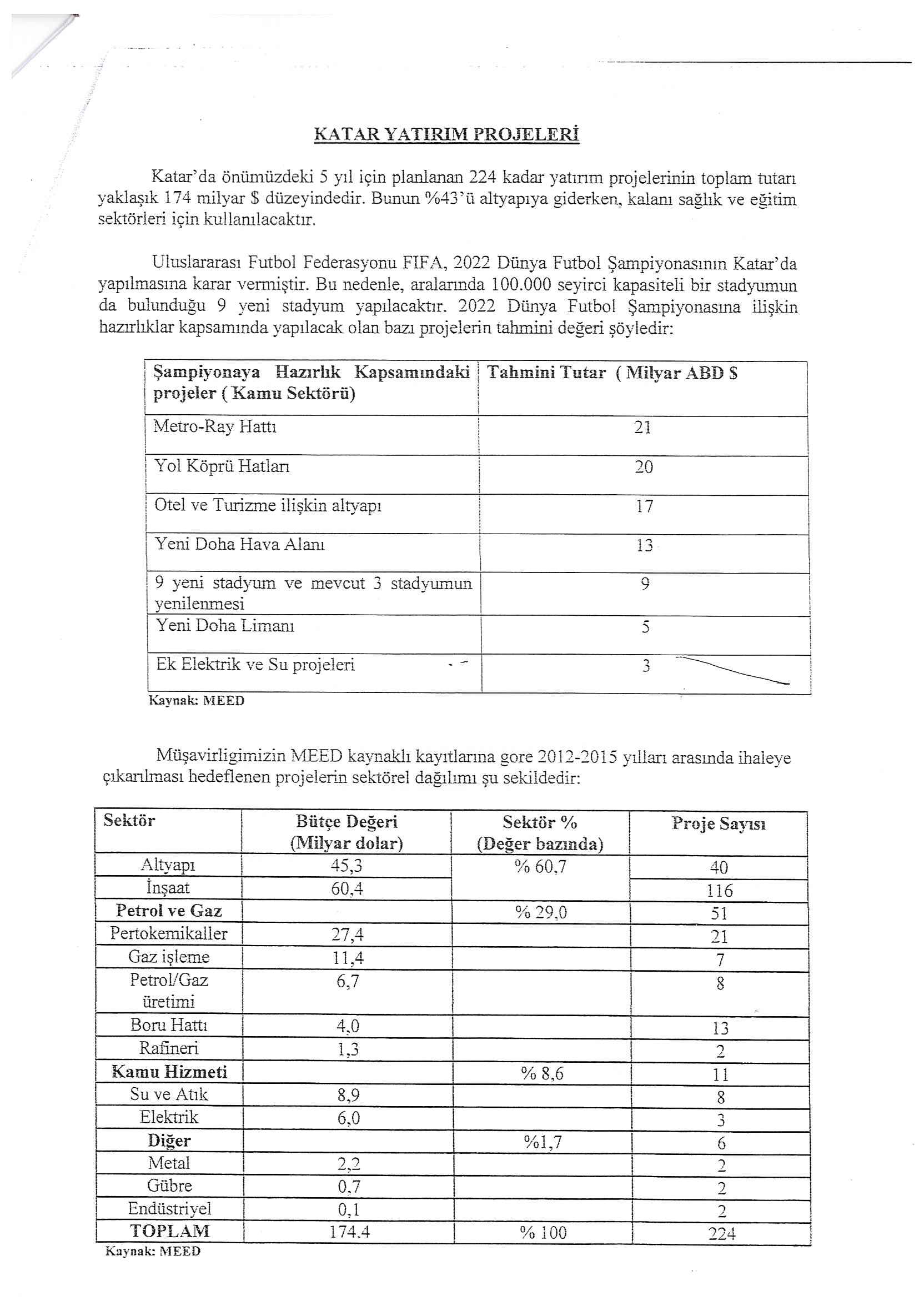 Yazıda devamla, 2013 ve daha sonrasında ihaleye çıkılması düşünülen projeler ile Katar'da 2022 yılına kadar altyapı ve üstyapı sektörlerinde toplam yaklaşık 174 milyar dolarlık yatınm yapılmasının öngörüldüğü ifade edilmektedir. Yatırım yapılması planlanan sektörlerle ilgili detaylar ekte yer almaktadır.
