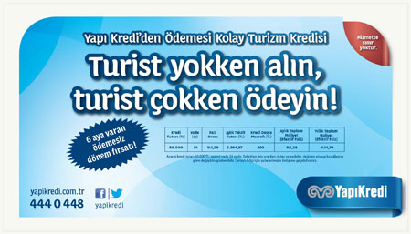 Bodrumlu turizmciler, Kasım ayına Yapı Kredi'nin “turist yokken al, turist çokken öde” sloganlı kampanyası ile başladı. Kampanya kapsamında Bodrumlu turizmciler, Yapı Kredi şubelerinden yapacakları ihtiyaç, tedarik veya tadilat amaçlı kredi kullanımlarının ödemelerini turizm sezonu açılışına kadar erteleme imkanına sahip olacak. Ayrıca Yapı Kredi'nin sunmuş olduğu KOBİ Bankacılığı ürün paketlerine sahip olan işletmelere kredi faiz oranlarında özel indirimler uygulanacak.